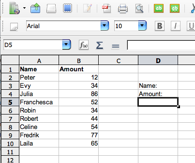 Go to cell D3 and enter "Name:". In D4 you enter "Amount:".